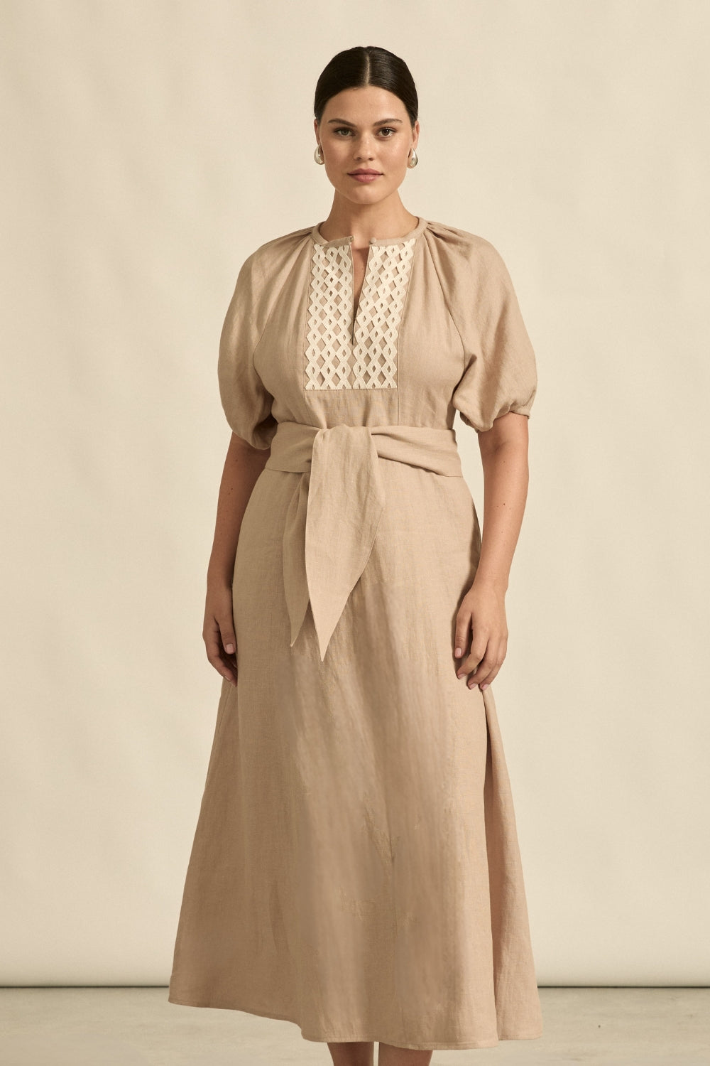 An ode to organic textures and quiet femininity, the harvest dress evokes resortwear ease through soft linen, bib lace detailing, and subtle gathering. relaxed yet refined.