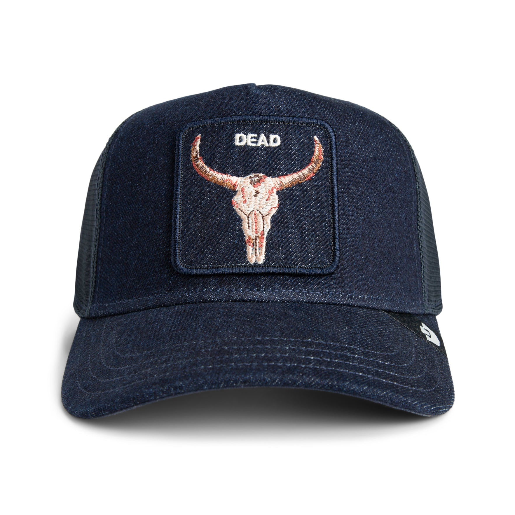 Skulls, denim, dust—straight off the highway shoulder where legends leave their mark. This lid is slightly haunted. A bull’s head stripped to bone, stitched into indigo, staring back at the world like a warning sign. For riders who know the end isn’t something to fear—it’s fuel.