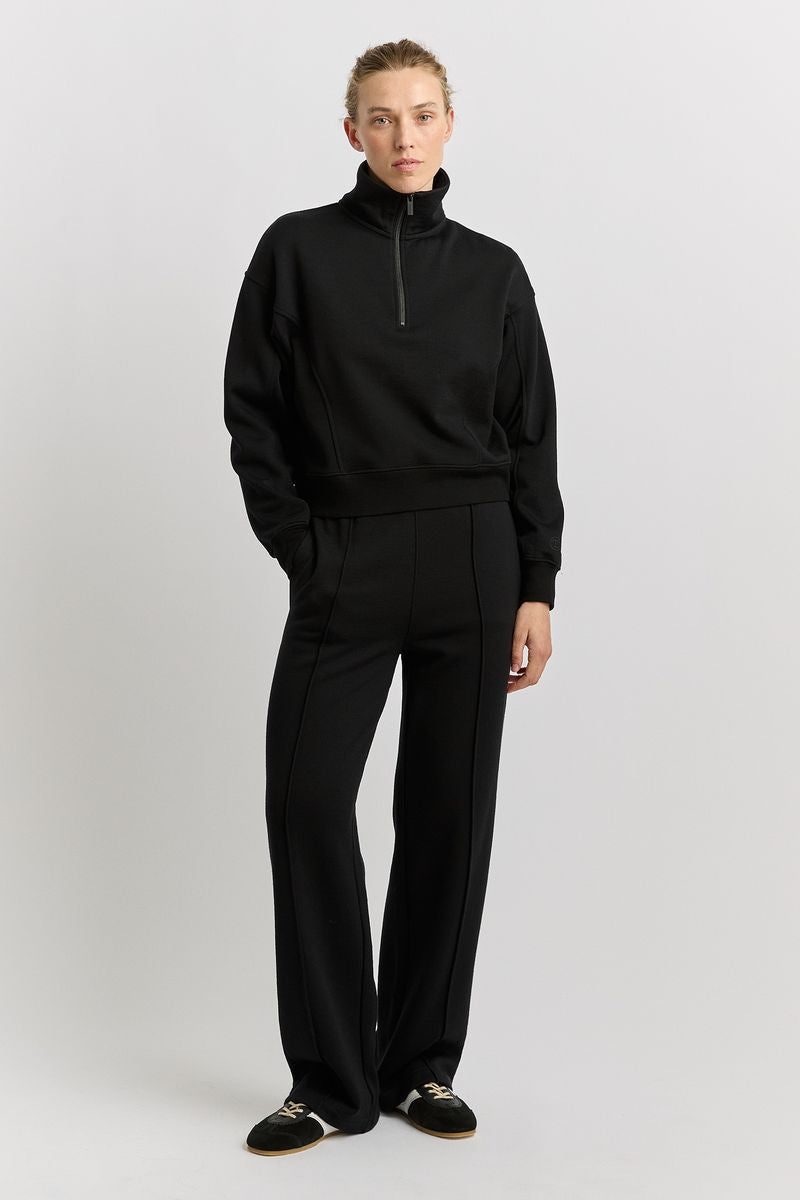 The Lounge Cropped Half Zip has a relaxed, atheltic silhouette with a tall standing collar and a branded quarter zip. It has drop shoulders and is designed to finish at the low waist.