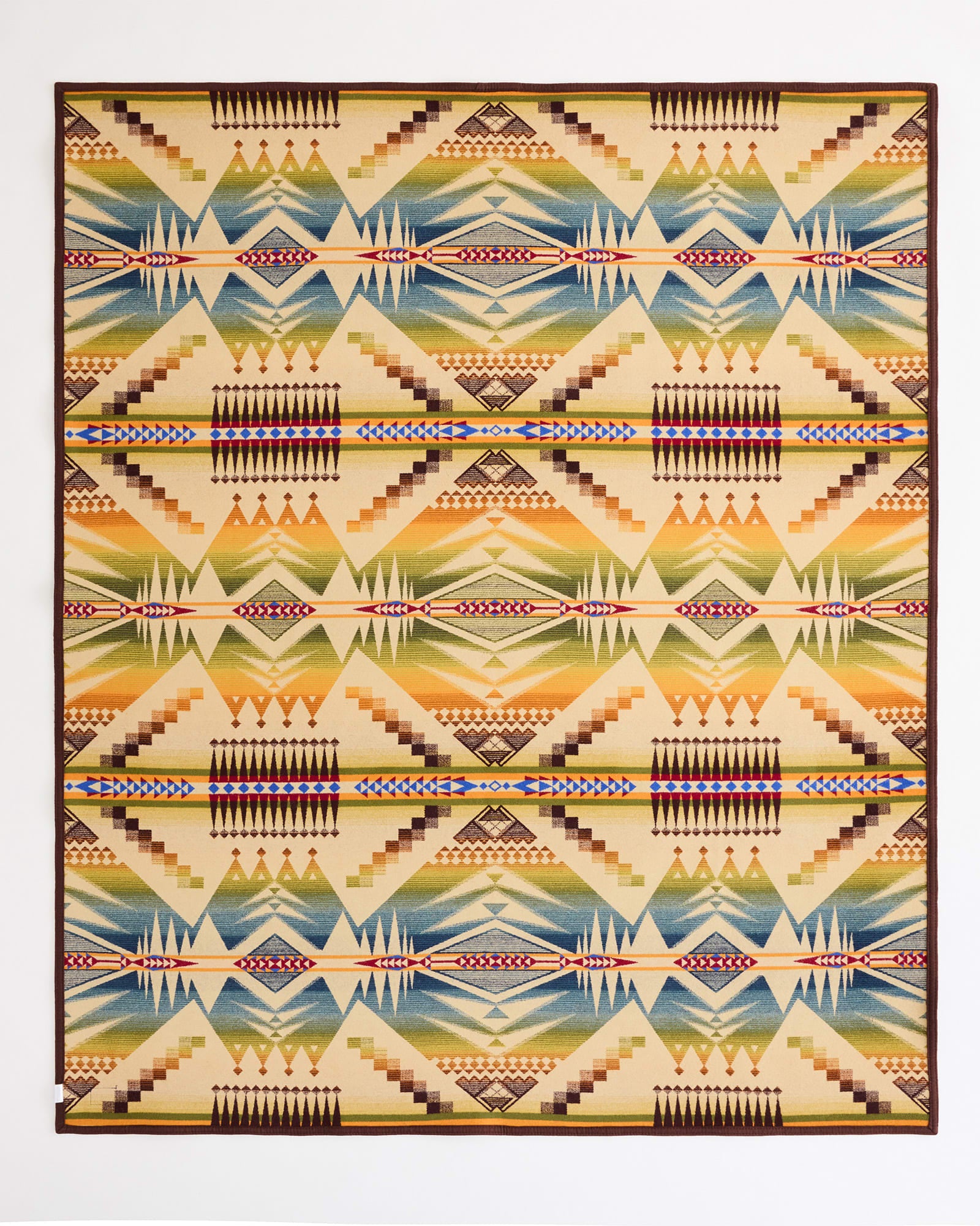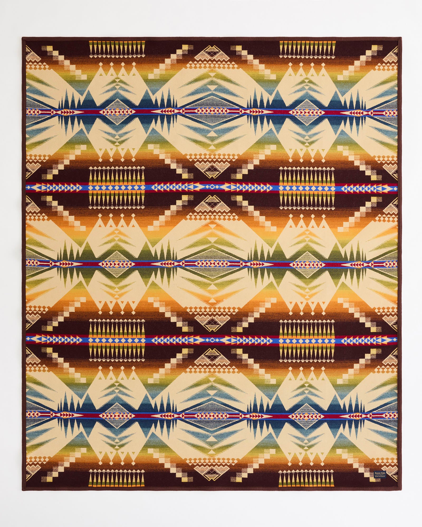 High in Montana's Beartooth Mountains lies Mystic Lake. Dramatic peaks surround the lake and cast their reflections in its still, cold surface. In this wool blanket design, a pattern of triangular shapes mirrors the area's dramatic landscape, with a solid neutral ground representing the lake's sandy beach. The icy waters support a fish hatchery; thus colorful groups of narrow shapes represent rainbow trout darting through the pristine beauty of Mystic Lake.