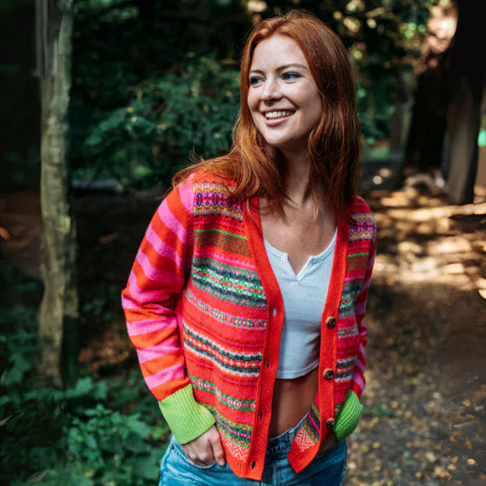 With its captivating combination of Fair Isle patterns and vibrant stripes, the Stobo V Neck Cardigan is a true celebration of colour and fun. Each stitch tells a story, weaving together a tapestry of hues that will brighten even the dreariest of days.