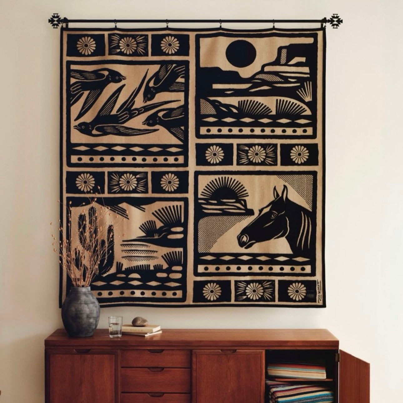 Artist Jess Mudgett's bold design captures the spirit of Saratoga, Wyoming, where swallows fly above the waters of the North Platte River. This small town is the heart of a wilderness where wild horses roam miles of open land. Sagebrush, wildflowers, and hardy grasses stabilize the shifting sands of the nearby high desert. The artist first came here at a young age with his father to watch wild horses in the badlands. Ever since, the wild beauty surrounding Saratoga has been a wellspring of inspiration.